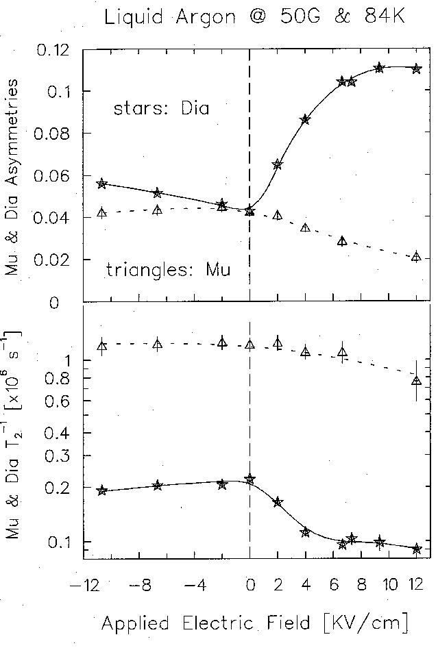 Liquid Argon @ 84K, TF=50G: Dia and Mu Asymm, Rlx rate vs E